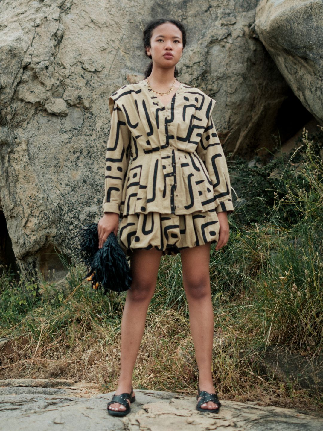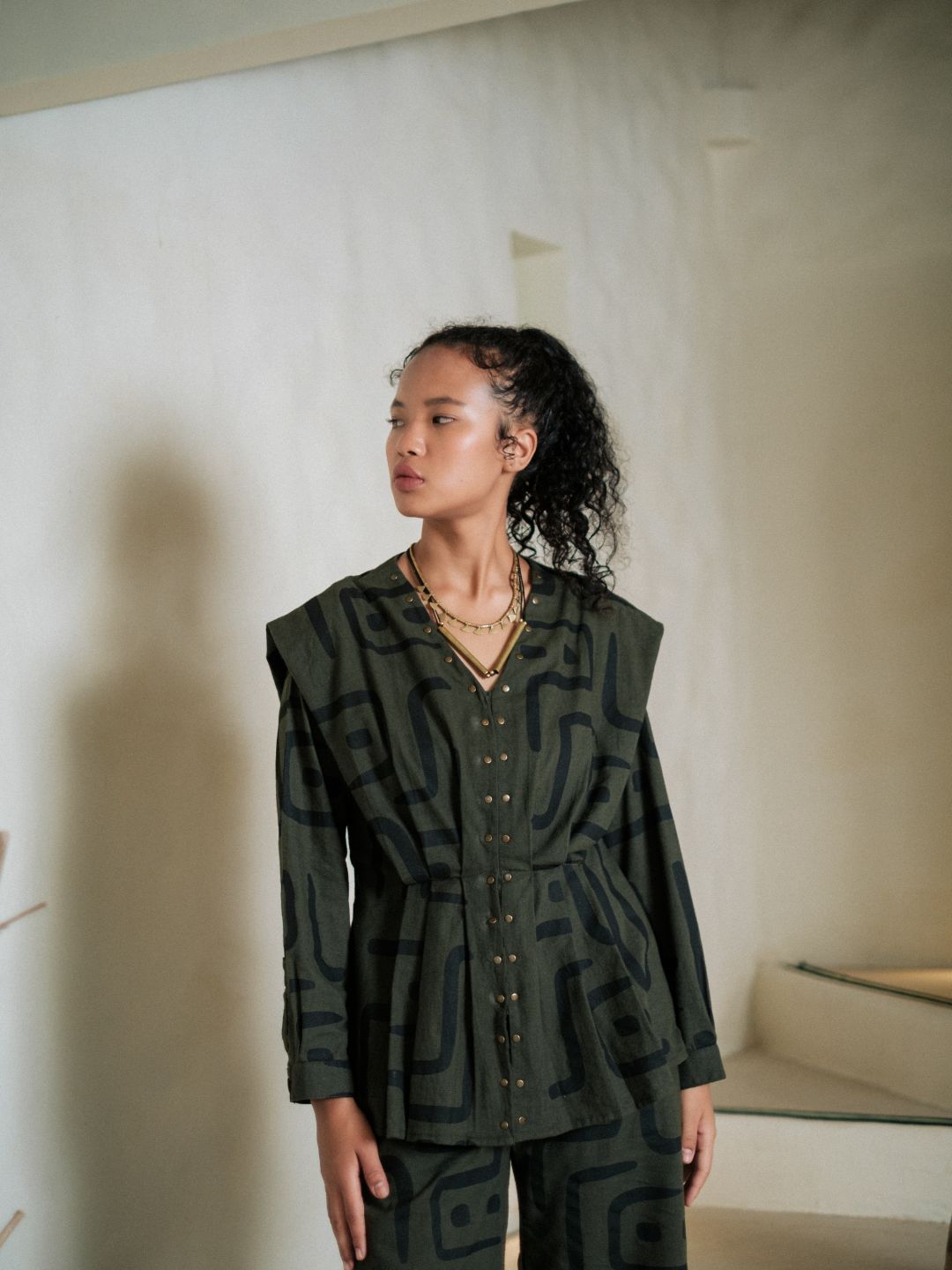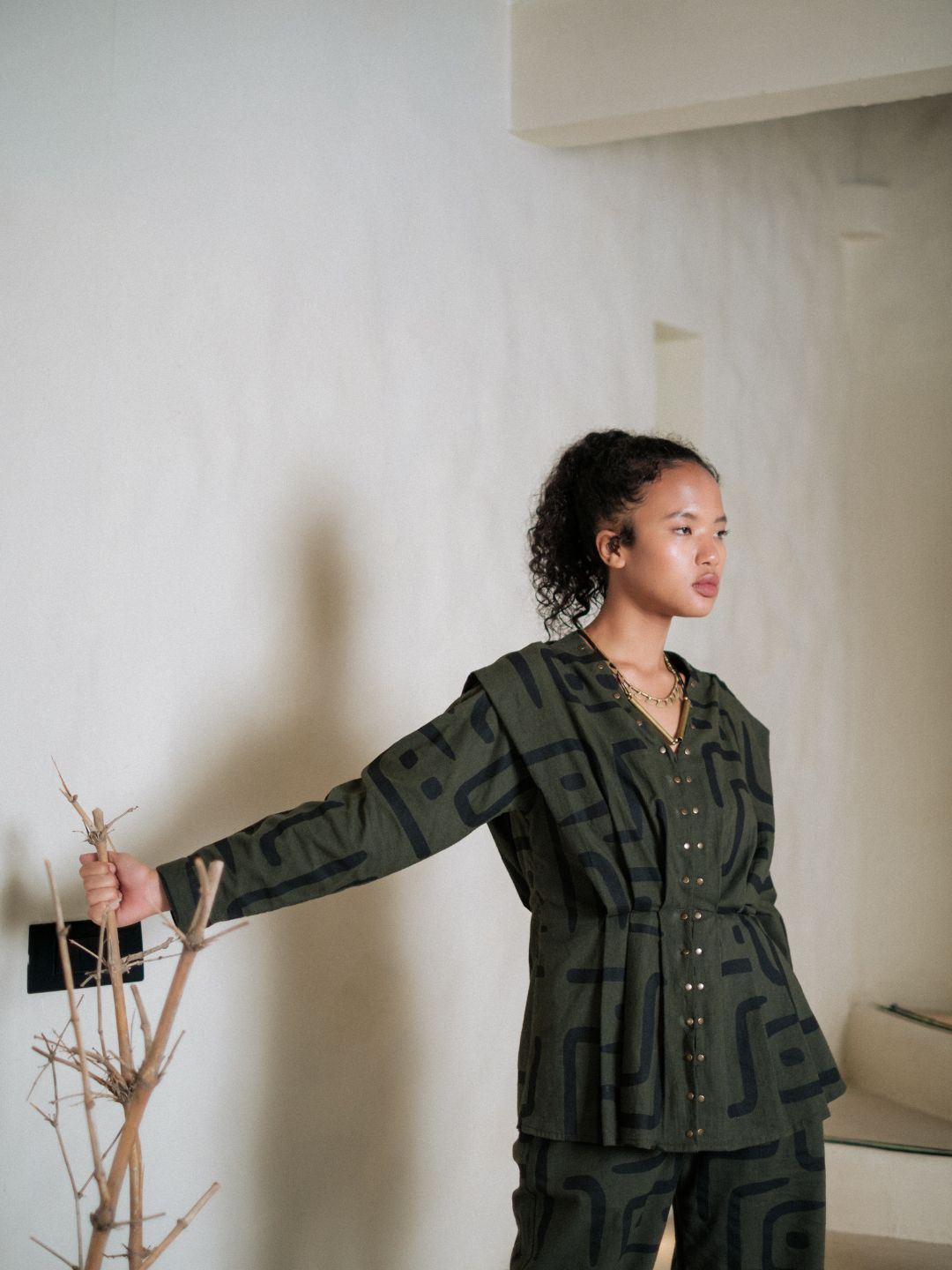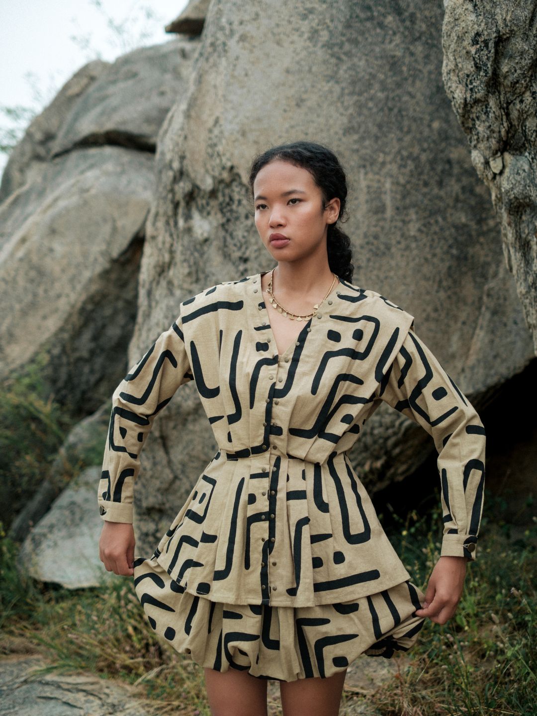 This top, made from textiles inspired by African mud cloth, featuring pleats and metallic rivet detail, pairs perfectly with the flared pants.