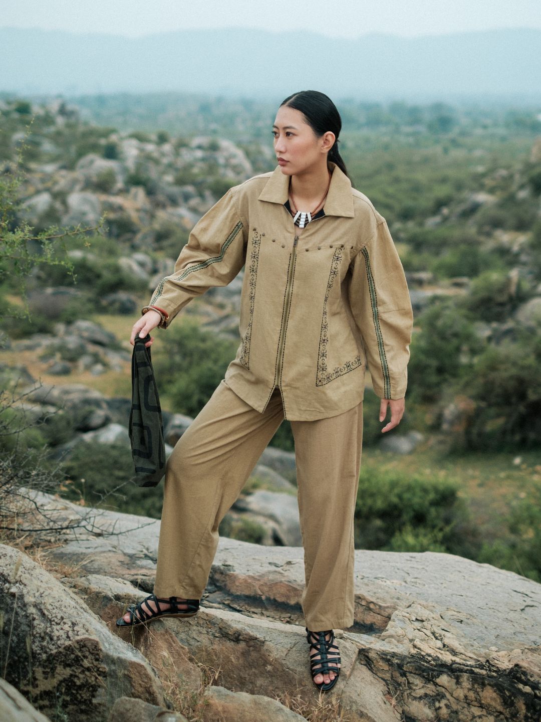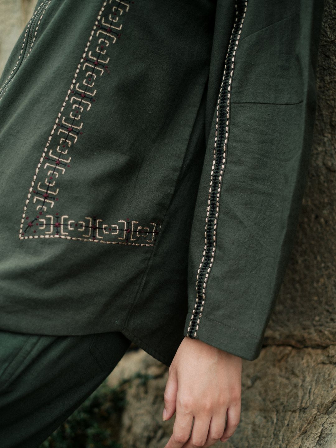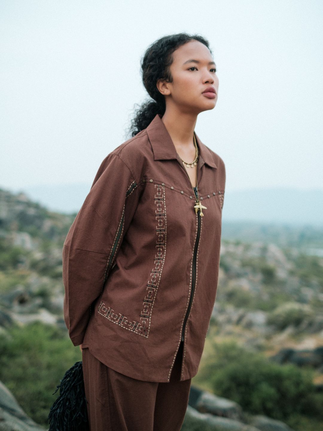 An oversized shirt with tribal embroidery, a zipper, and barrel sleeve detail. A great addition to travel and everyday clothing alike.