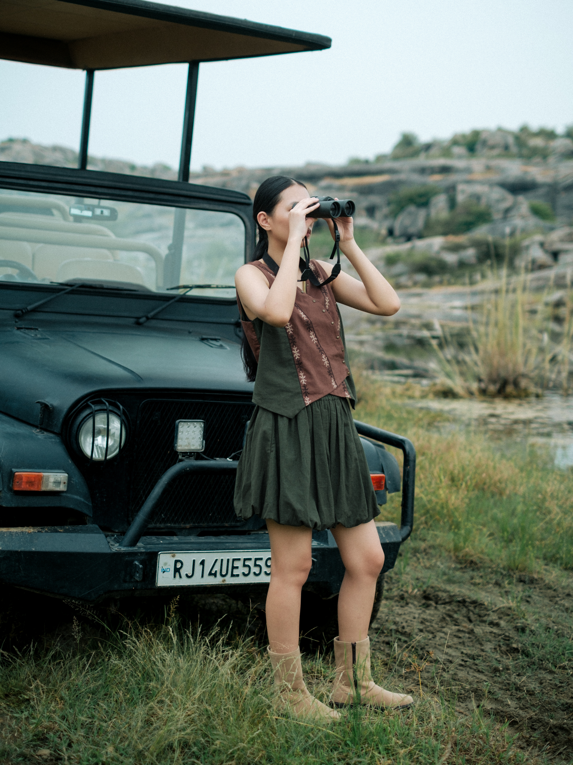 This versatile vest, featuring tribal embroidery, is the perfect addition to your wardrobe. It pairs perfectly with our balloon skirt and barrel pants.